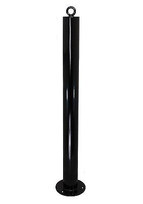 Bolardo estático negro atornillado de acero, 80 mm de diámetro, 900 mm de alto y ojal ubicado en la parte superior (a menudo se usa con cadena o cuerda).